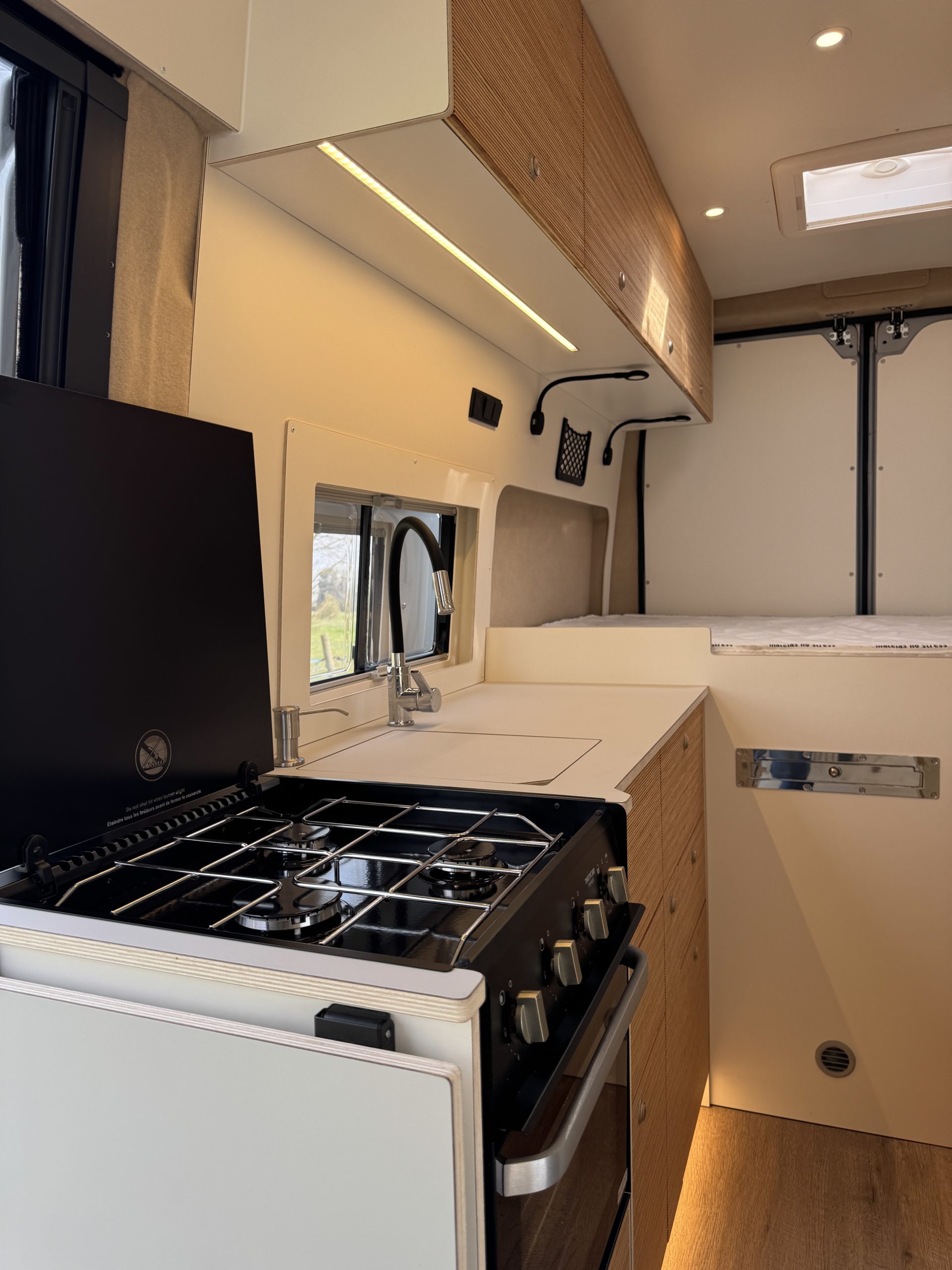 Gusto est un aménagement réalisé sur base de Fiat Ducato L4H3, conçu pour un usage régulier avec un haut niveau de finition et de durabilité.
