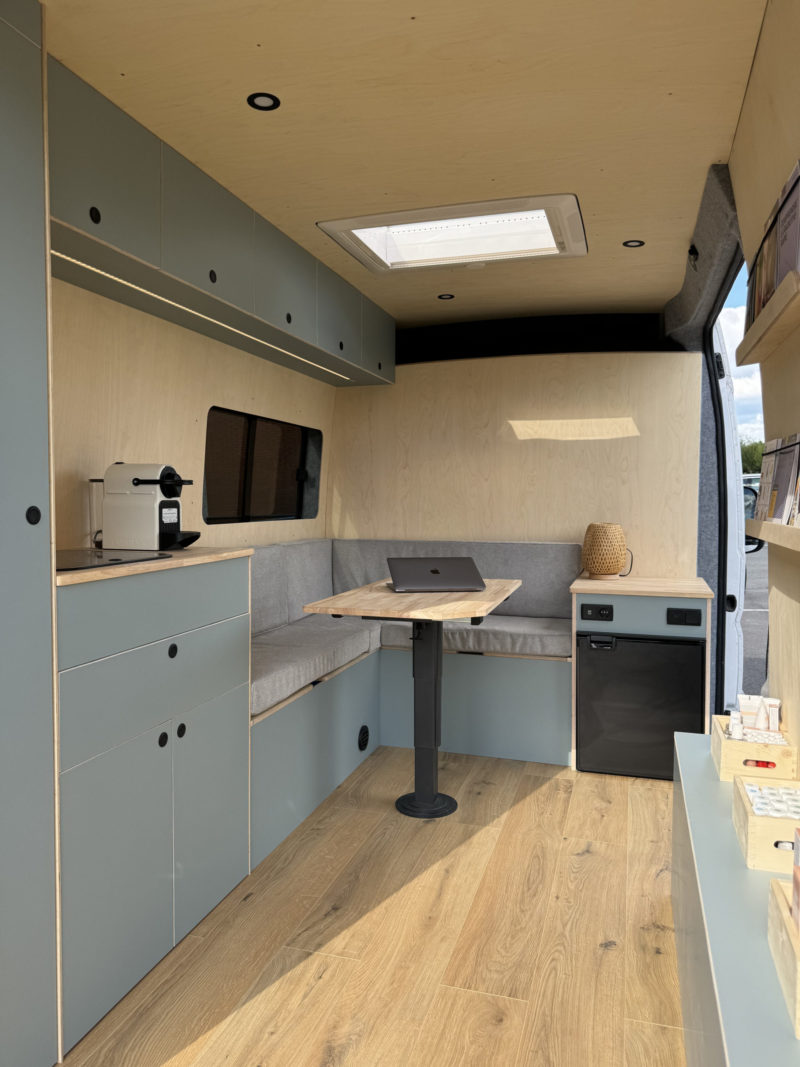 Ce premier aménagement de fourgon professionnel a posé les bases du projet. L’objectif était de concevoir un espace chaleureux et apaisant, pensé pour favoriser l’écoute, l’échange et l’accompagnement. Lumière douce, matériaux naturels et mobilier sur mesure créent une atmosphère accueillante, loin de l’environnement médical classique.