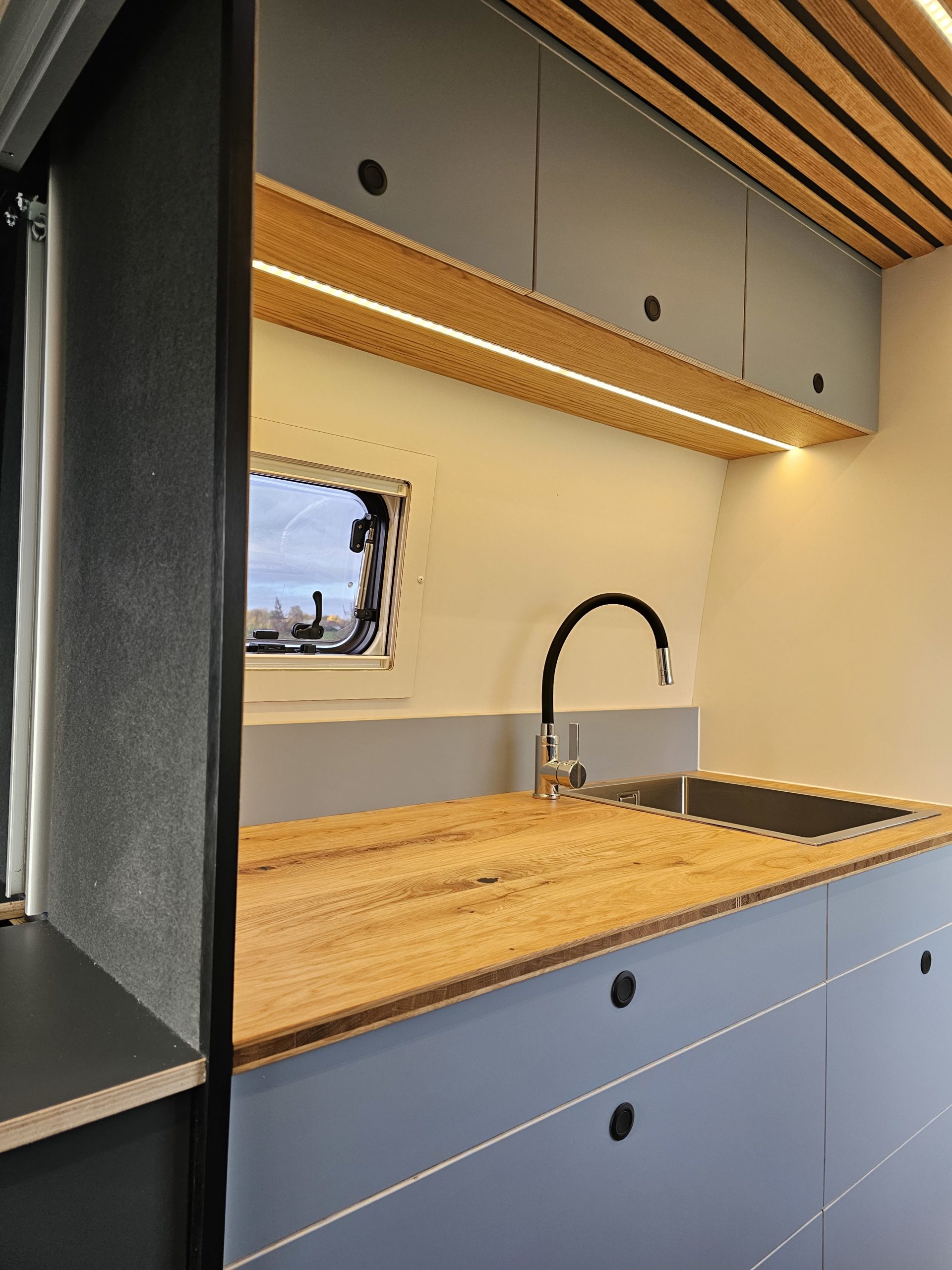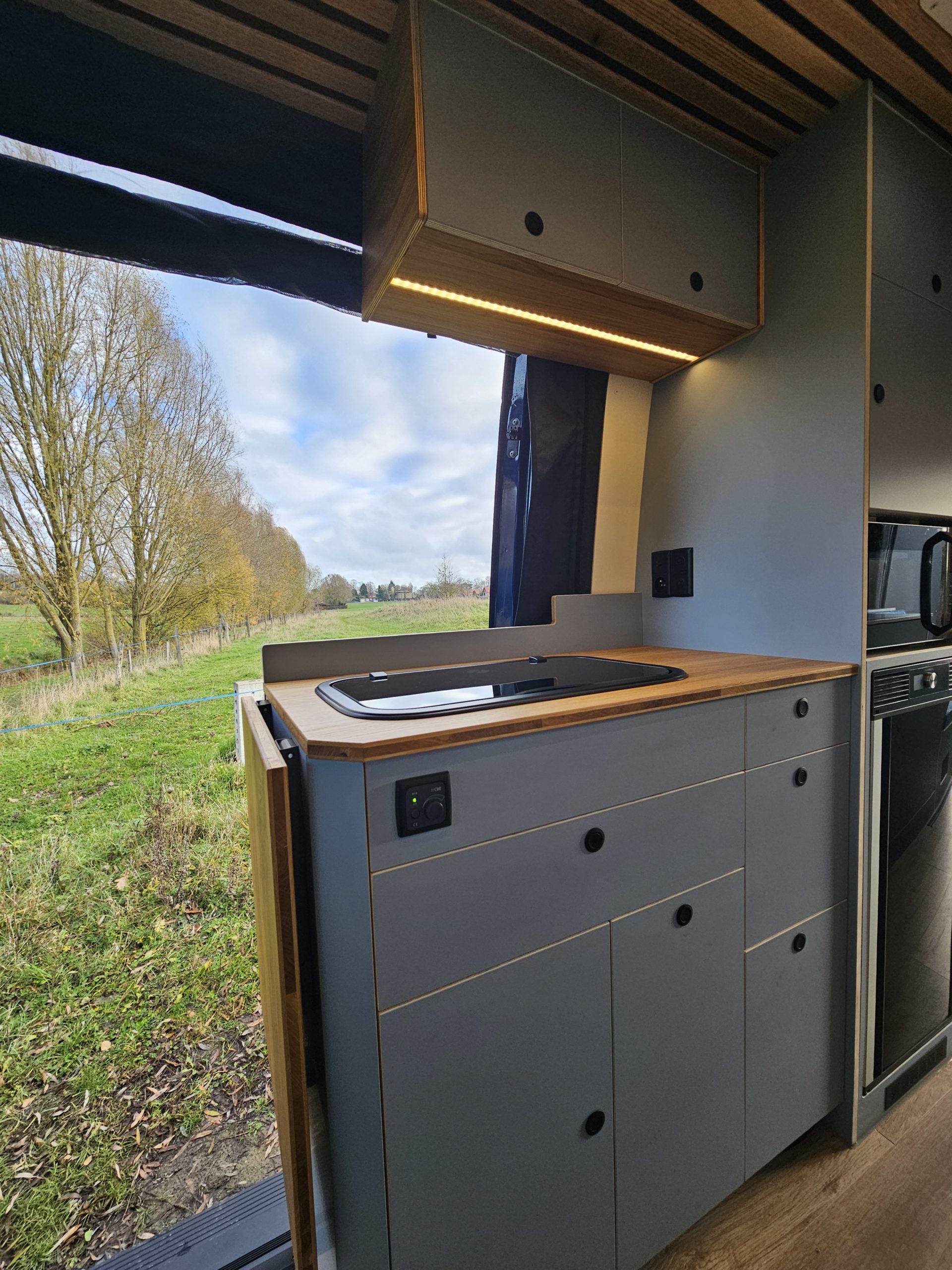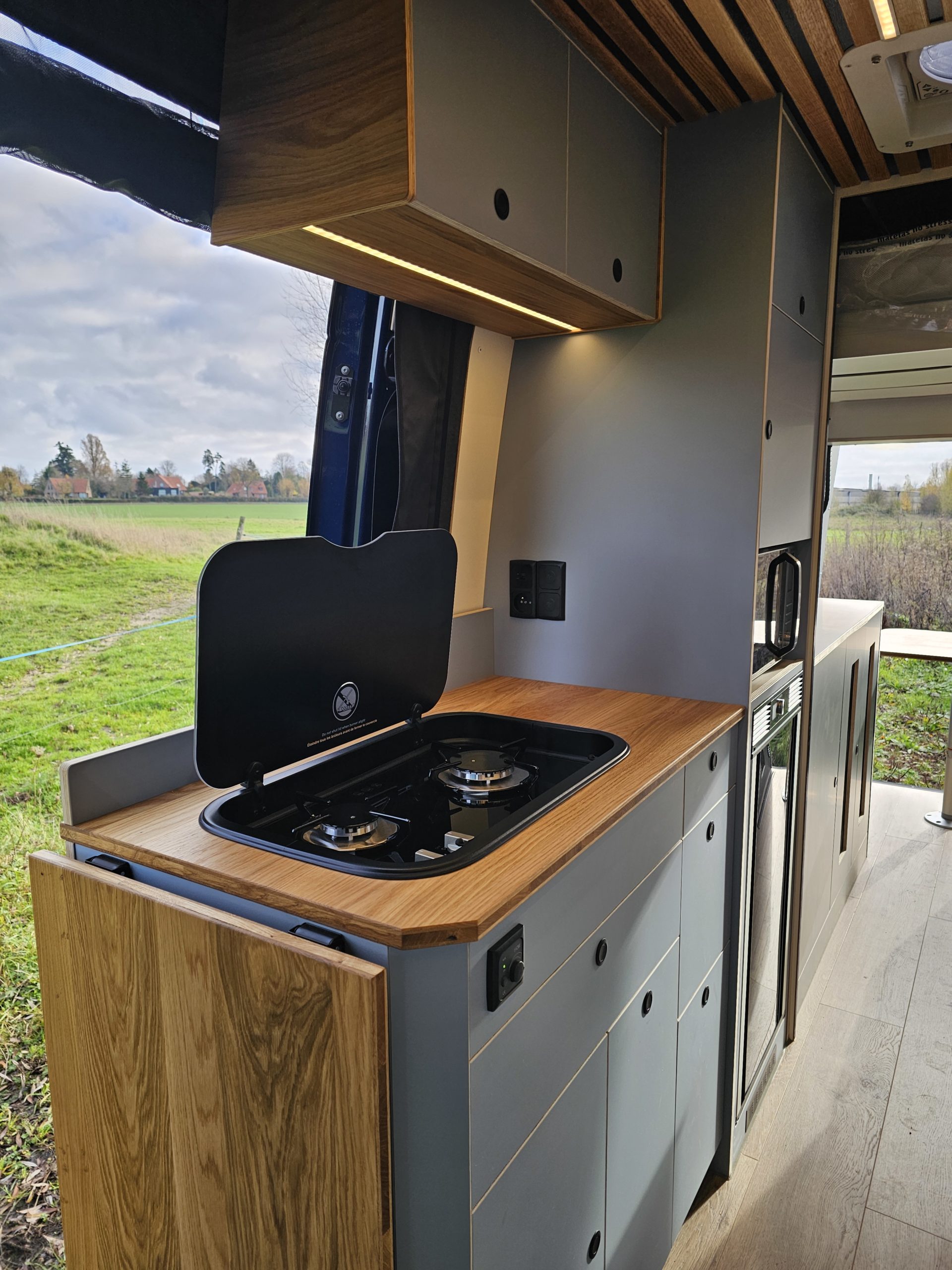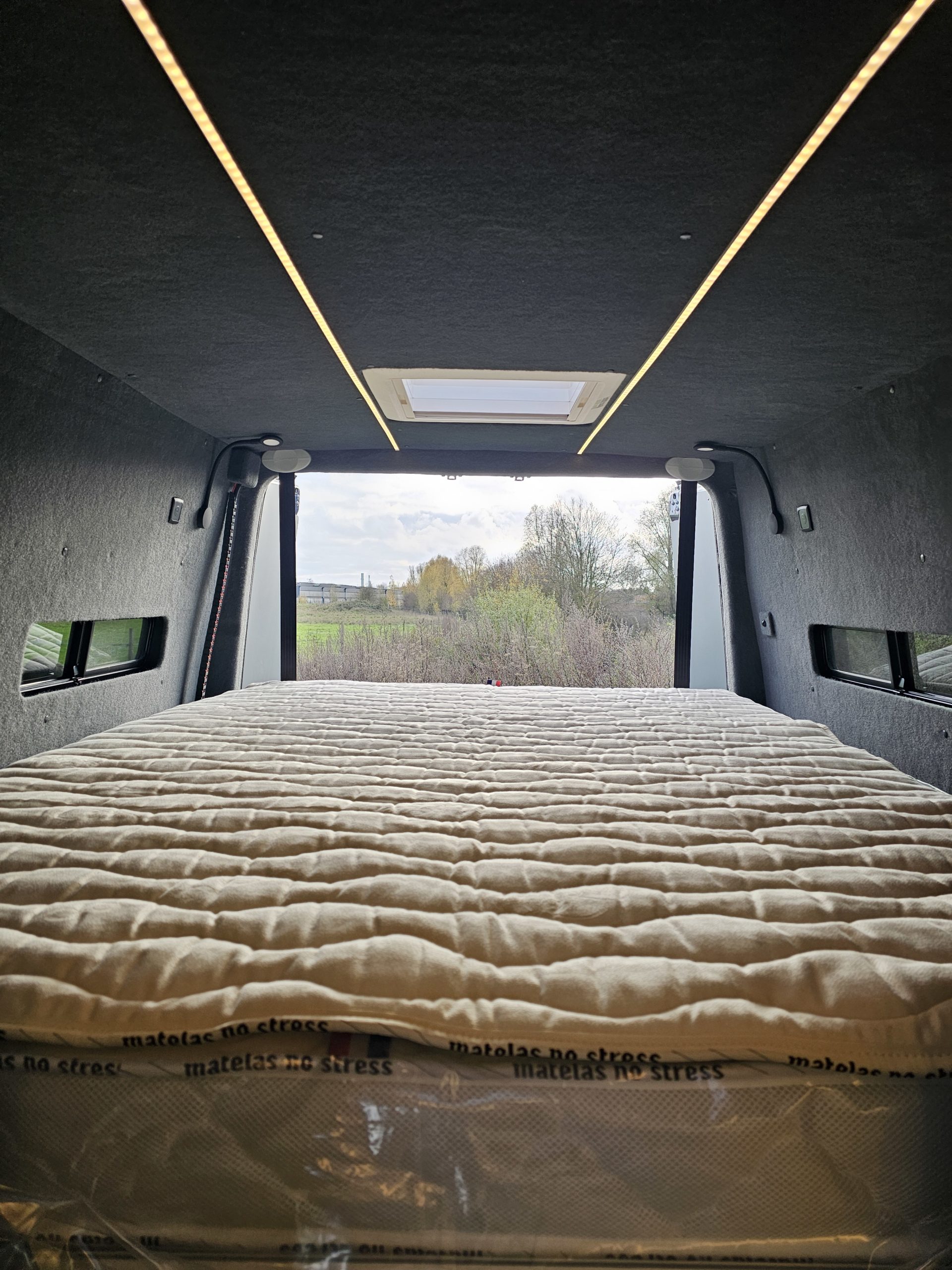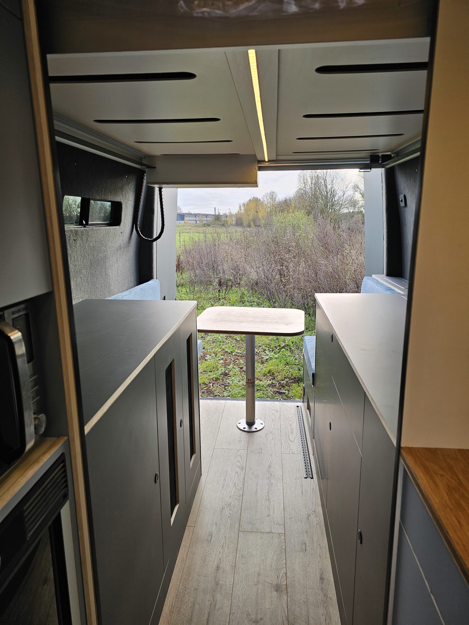 Conçu et fabriqué dans notre atelier, cet aménagement mise sur l’efficacité : un système électrique surdimensionné pour l’off-grid, un chauffage diesel prévu pour les nuits froides en altitude, une cuisine sur-mesure pour les road trips au long cours, et un lit relevable pour maximiser l’espace sans compromis.