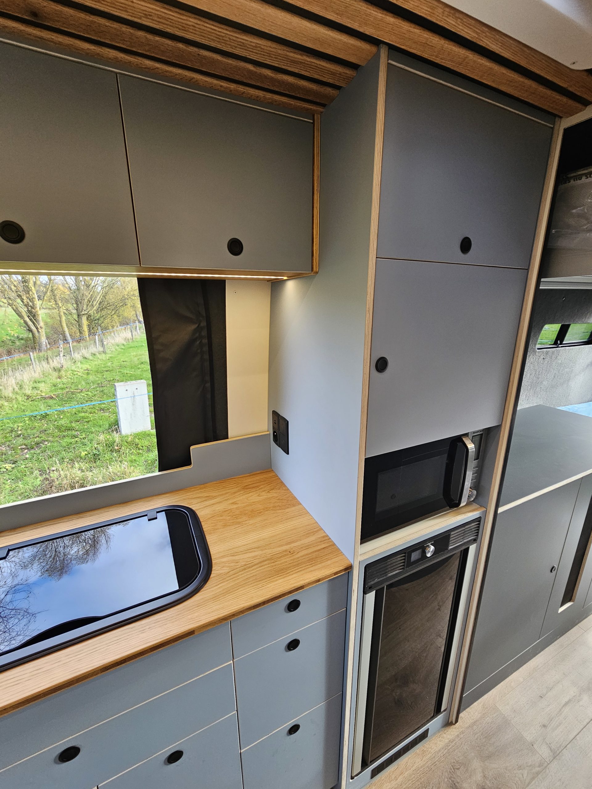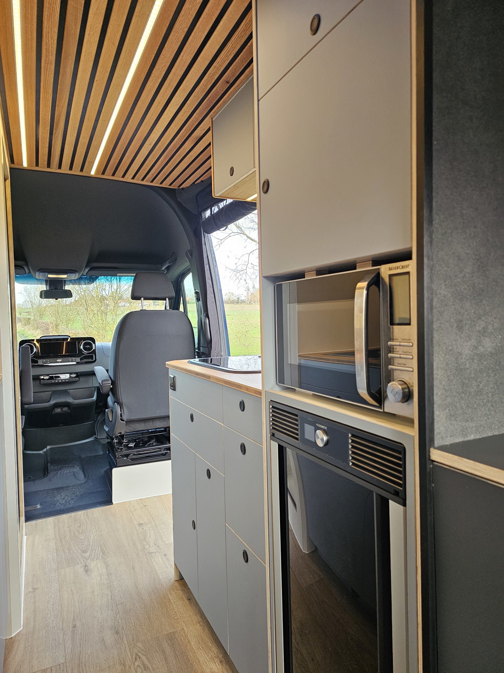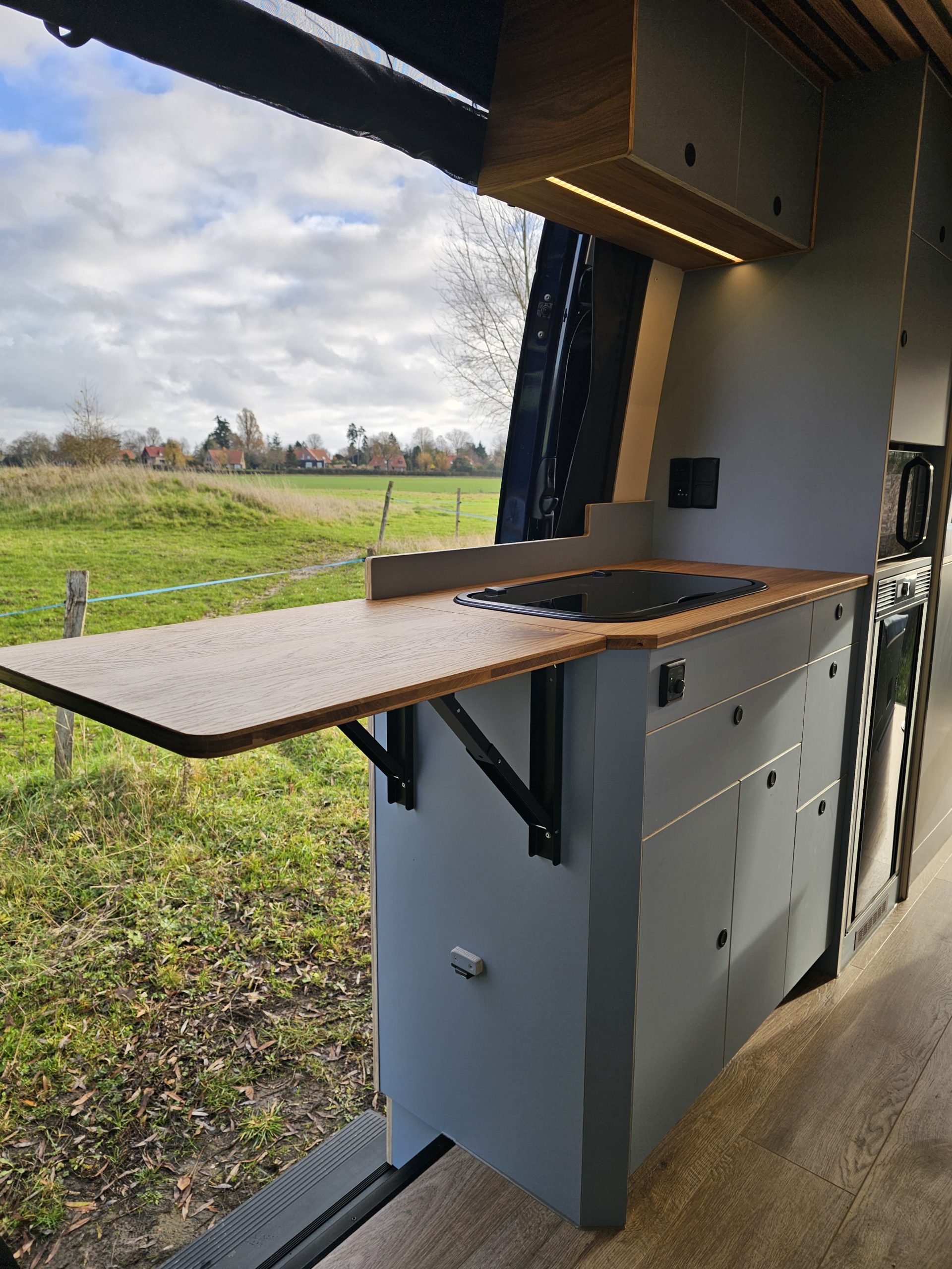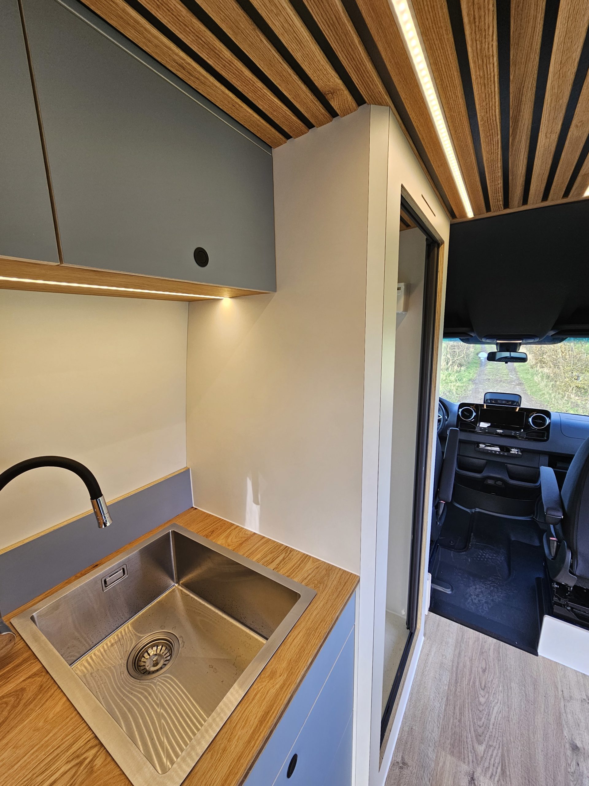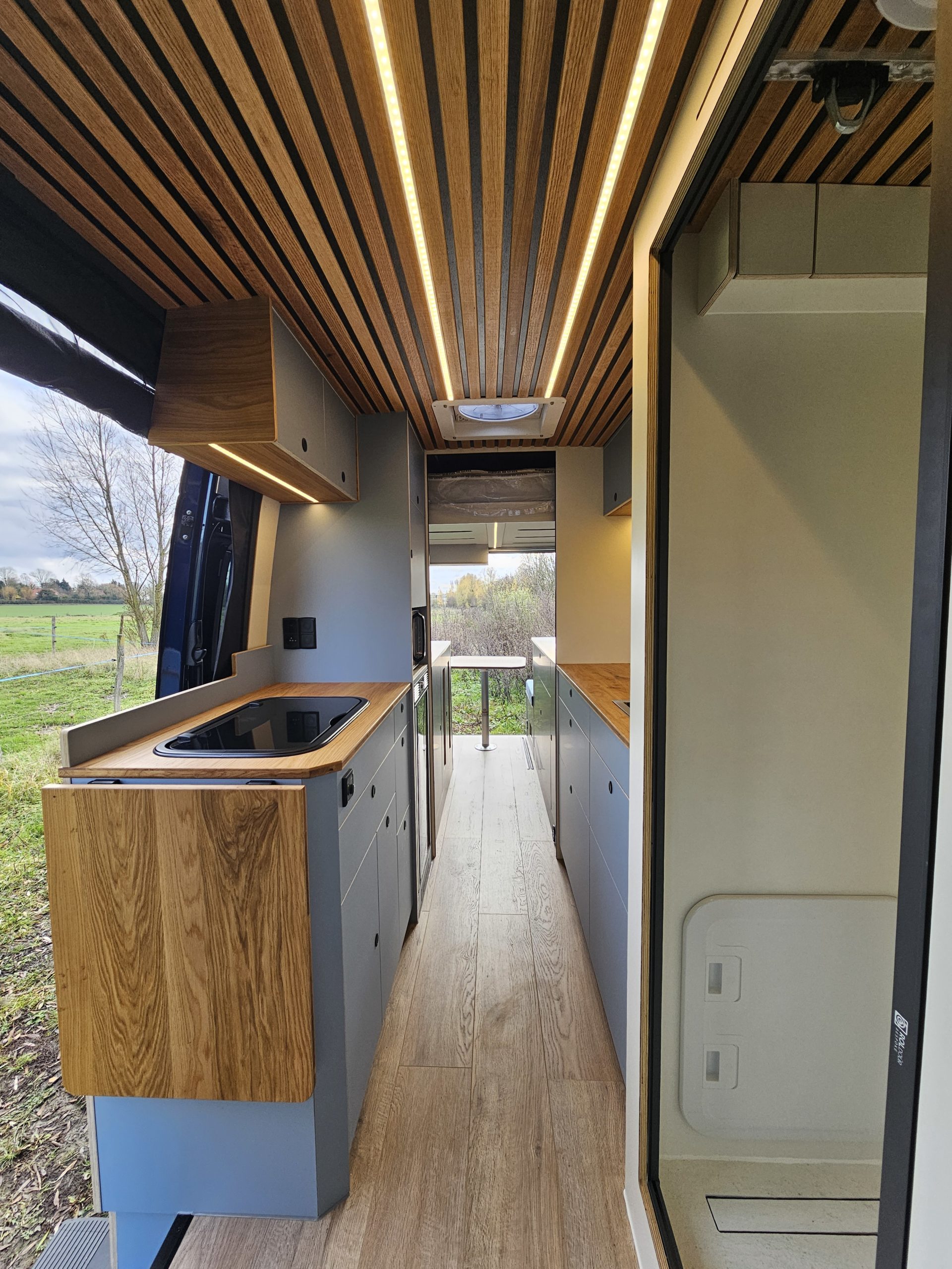 Conçu et fabriqué dans notre atelier, cet aménagement mise sur l’efficacité : un système électrique surdimensionné pour l’off-grid, un chauffage diesel prévu pour les nuits froides en altitude, une cuisine sur-mesure pour les road trips au long cours, et un lit relevable pour maximiser l’espace sans compromis.