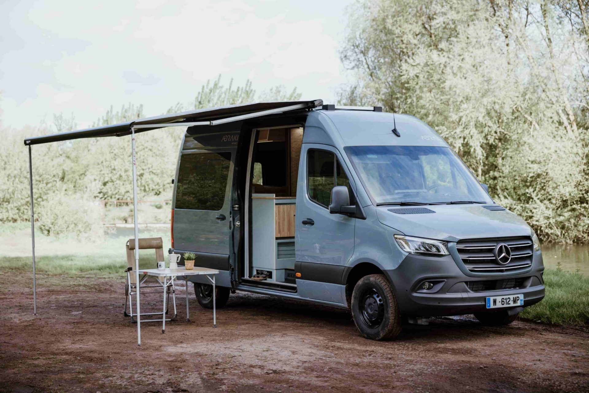 Le Mercedes Sprinter L2H2 Aoraki par OLEY WORKSHOP : un van aménagé haut de gamme prêt à vivre, avec son store Fiamma déployé et son mobilier extérieur pour profiter pleinement de la nature.